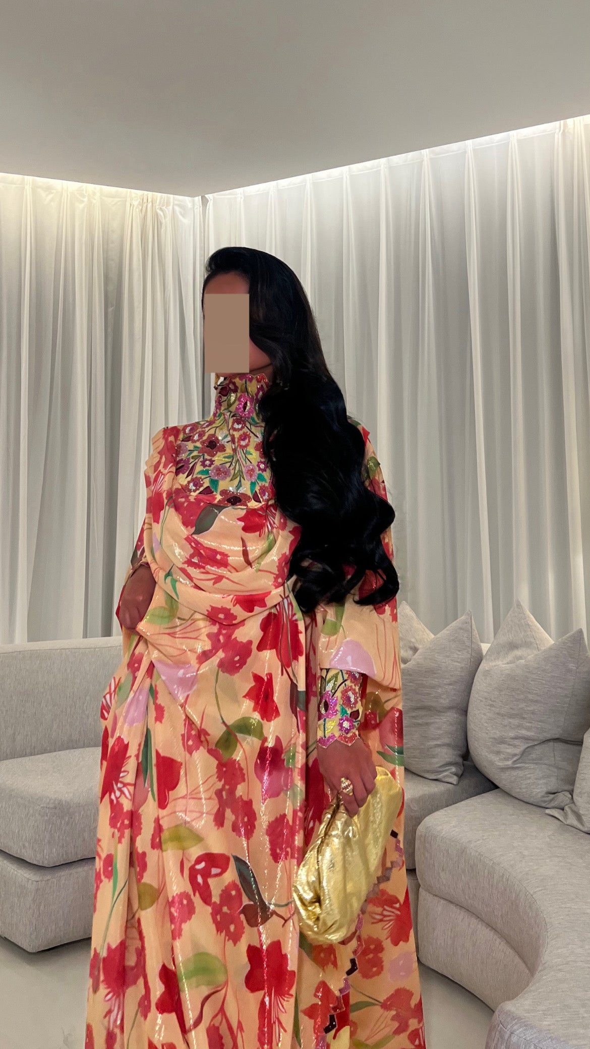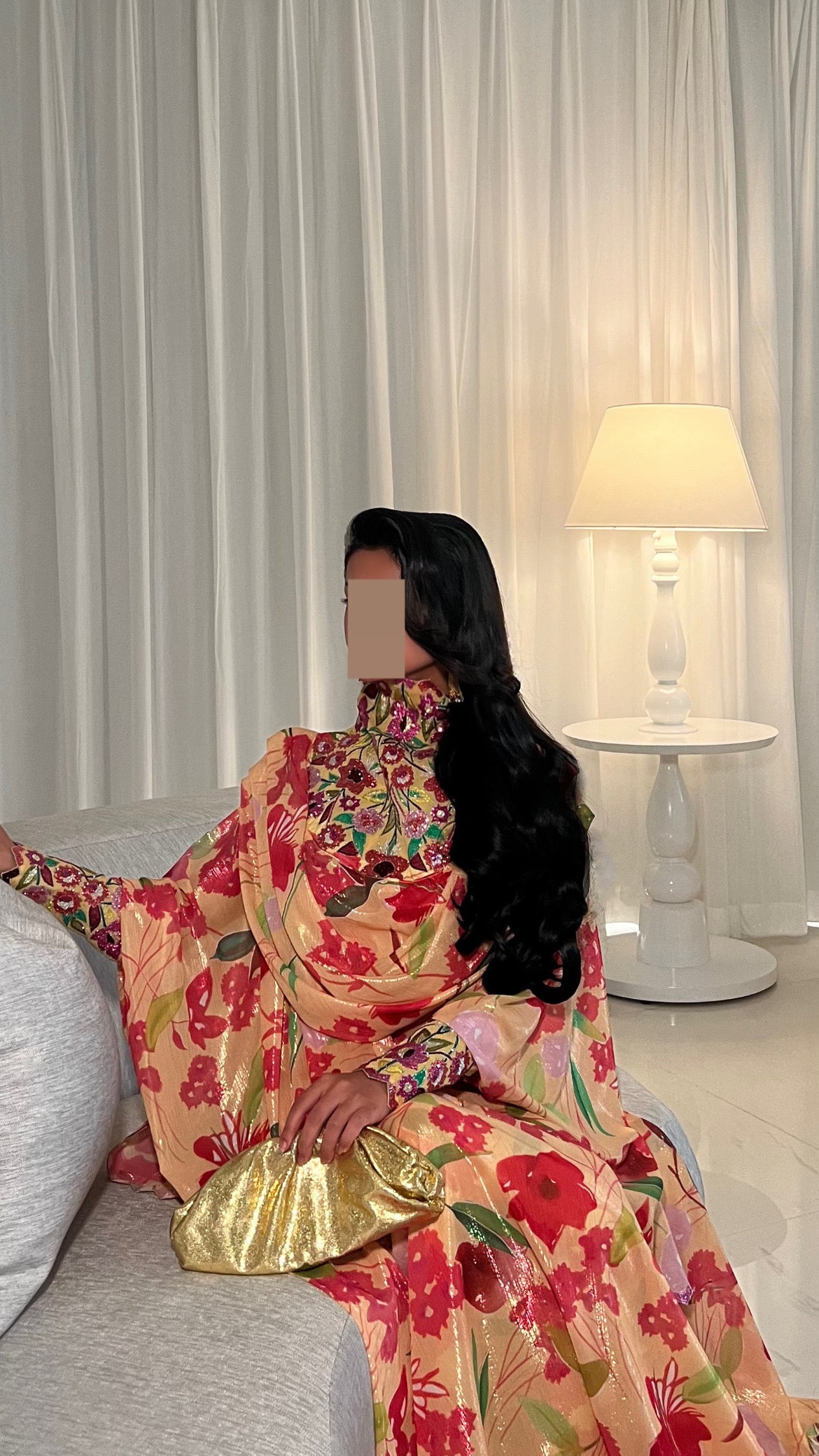 - ثوب عبارة عن قطعتين مع شغل يدوي فالصدر والرقبة ومن الظهر واربع سلاسل